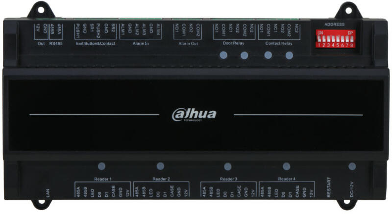 Dahua, ajtóvezérlő, TCP/IP, RS-485, Wiegand, Wiegand 26/34 bit, RS-485, 6 db kimenet, 2 x ajtózár, 4 x riasztó kimenet, 12 V DC, PoE